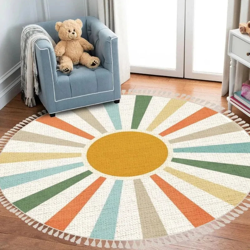 🌞✨ Transforme o quarto do seu pequeno(a) em um espaço cheio de magia e cores com o Tapete Redondo para Quarto Infantil - Coleção Arco-Íris Encantado. Seu design alegre e as cores suaves criam um ambiente que inspira sonhos, risos e muita criatividade.